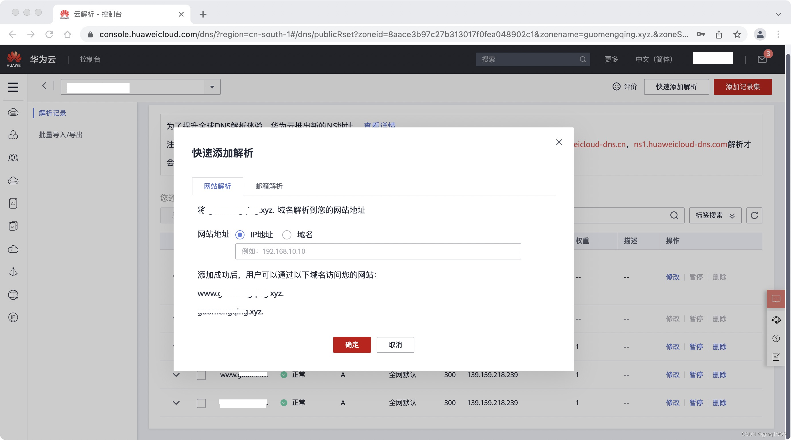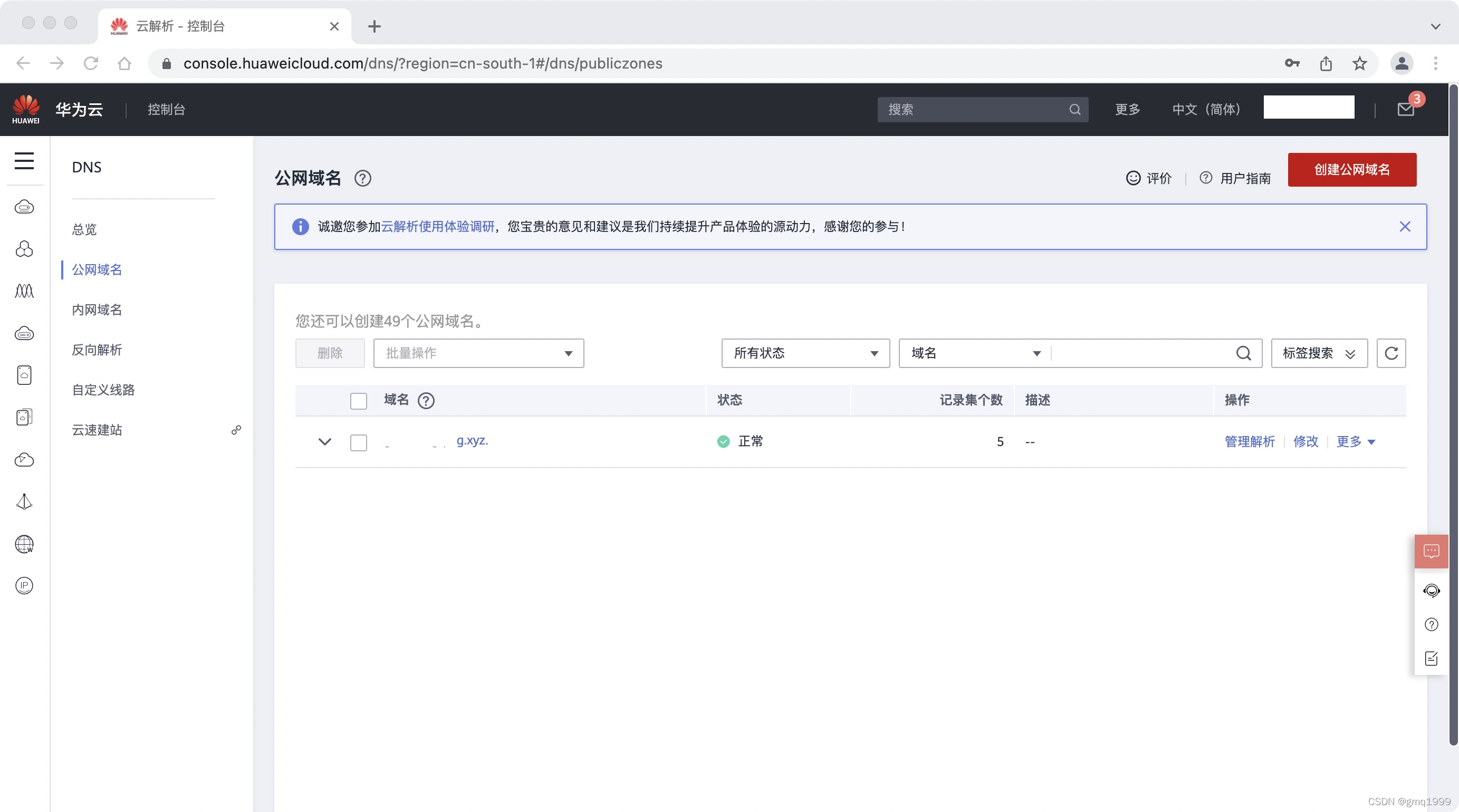 云解析控制台地址:https://console.huaweicloud.com/dns/?region=cn-south-1#/dns/publiczones