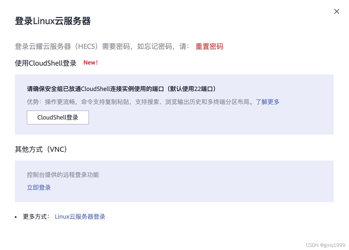 选择CloudShell 登录,VNC登录也可以,这里显示Linux云服务器是因为我在购买服务器时选择的就是这个。