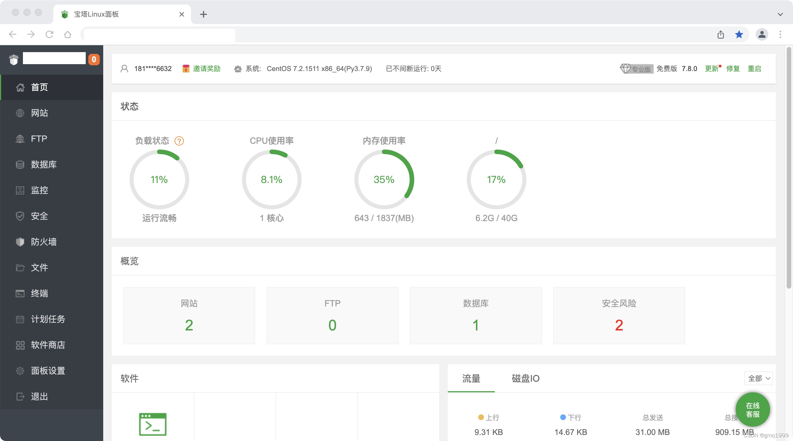 宝塔面板可以清楚的看到服务器的使用情况,进去的时候会有弹窗,询问是否安装环境,有FTP、PHP、Apache等等,选择安装,安装好之后点击左侧导航栏中的网站。