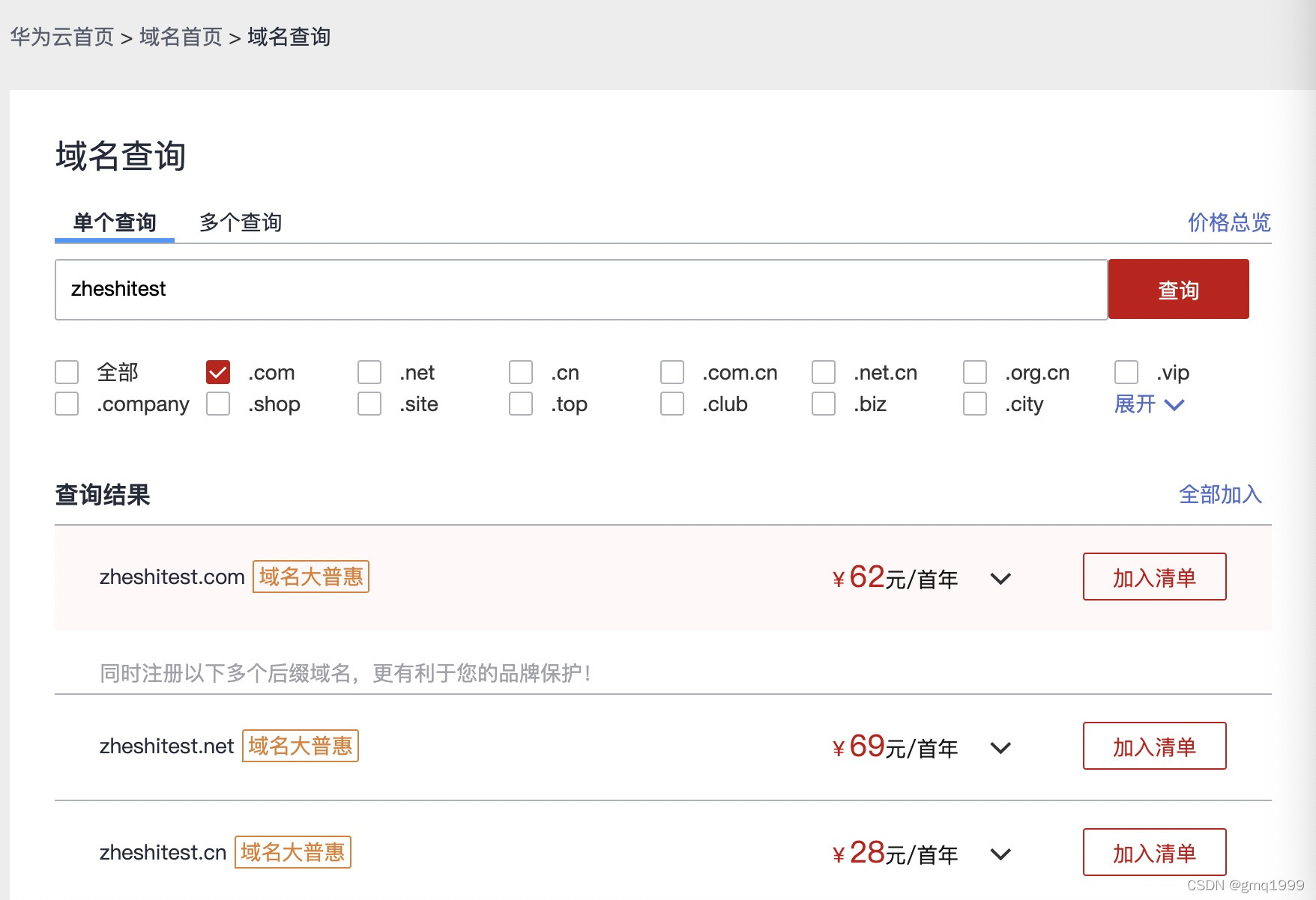 抢到优惠券后,在华为云官网的搜索中输入域名,会出现域名注册服务,点击“立即购买”