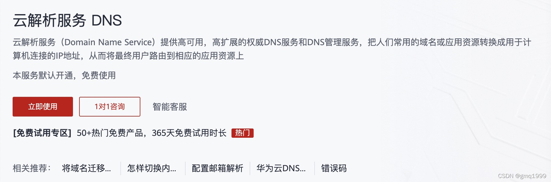 此时输入网址会发现还是不可以访问的,这是因为还没有做域名解析。在华为云官网输入域名解析,找到云解析服务 DNS,点击进入。