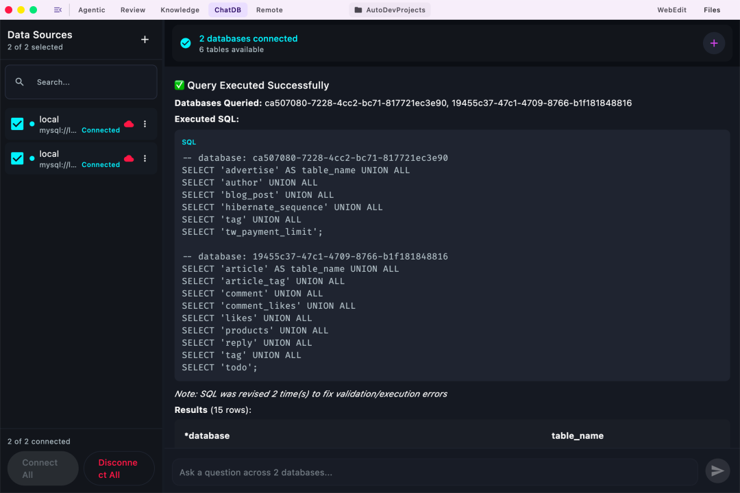 - 数据分析与验证:由 ChatDB Agent 完成,自然语言查询数据库并可视化结果;