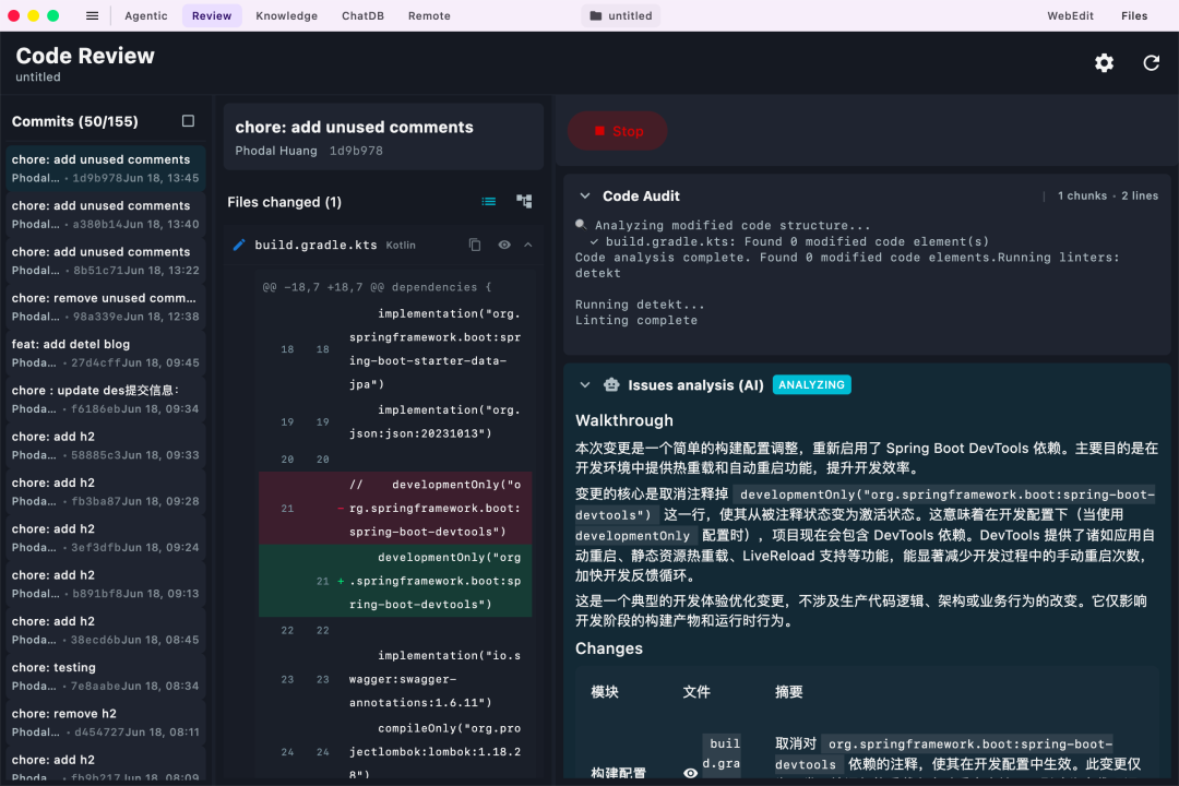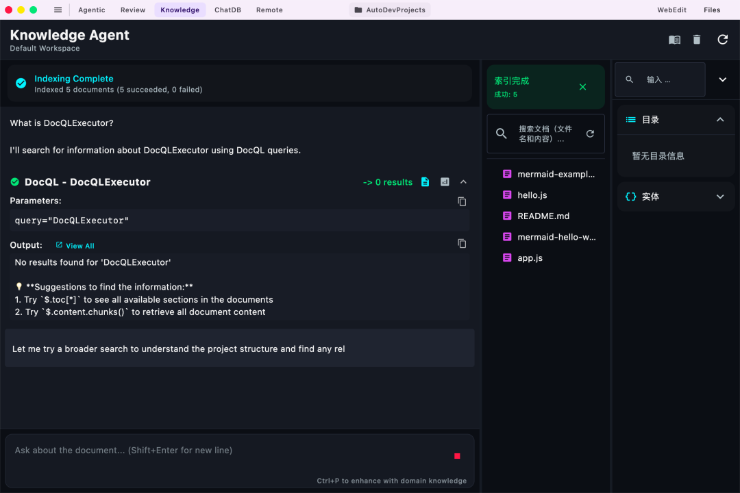 理解与探索:由 Chat 和 Knowledge Agent 负责,帮助开发者精准定位文档、架构和历史决策; 实现与修改由 Agentic Agent 执行,支持上下文感知的多轮迭代开发;