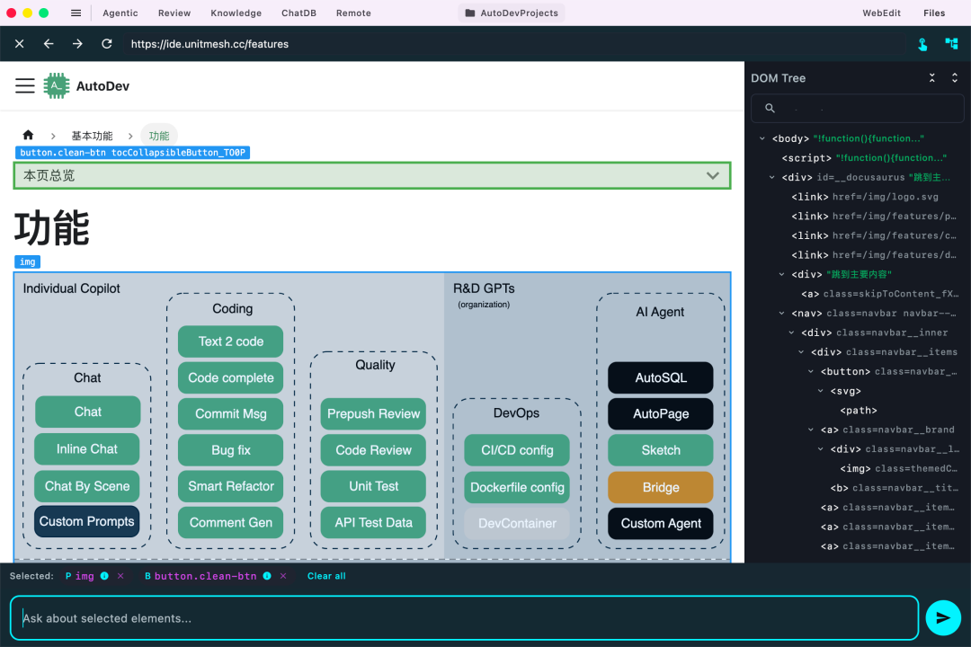 - UI / Web 调整:由 WebEdit Agent 执行,实现 DOM 与源码的双向映射;