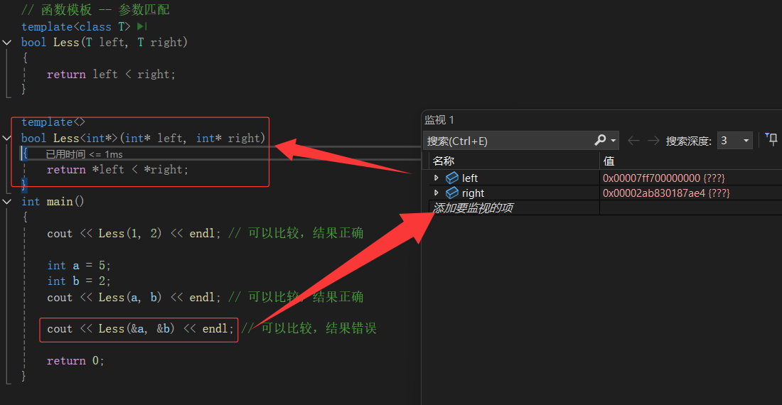 我们经过加上了特化后,发现,当程序走到取地址的地方,它会自己去特化的的地方调用,而不是走模板函数。 而且此时的结果是正确的了。