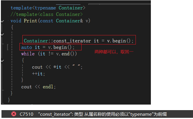 因为编译器搞不清楚它是属于那里的类型,要求加上typename+类型名称,如果不加typename,因为它没有实例化,编译器只有实例化后才敢取,但是const_iterator是对象还是变量类型?不确定,因为静态/内嵌类型也可以玩这个,比如: