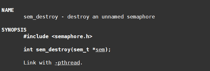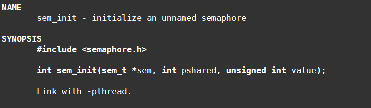 #include <semaphore.h> int sem_init(sem_t *sem, int pshared, unsigned int value); 参数: pshared:0表示线程间共享,非零表示进程间共享 value:信号量初始值