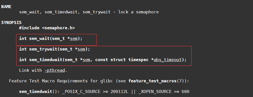 功能:等待信号量,会将信号量的值减1 int sem_wait(sem_t *sem); //P()