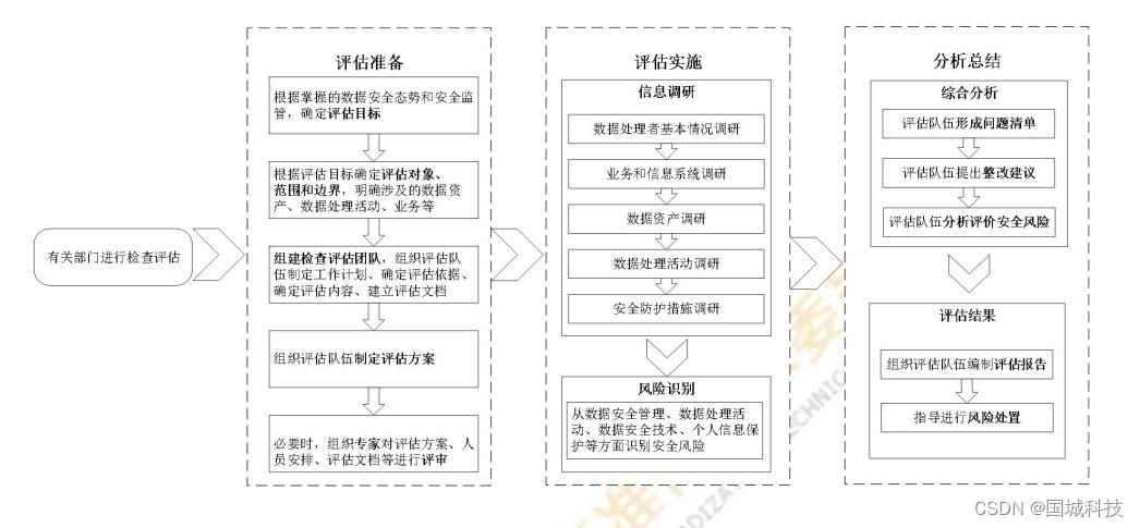 首先通过信息调研识别数据处理者、业务和信息系统、数据资产、数据处理活动、安全措施等相关要素,然后从数据安全管理、数据处理活动、数据安全技术、个人信息保护等方面识别风险隐患,最后梳理问题清单,分析数据安全风险,并给出整改建议。