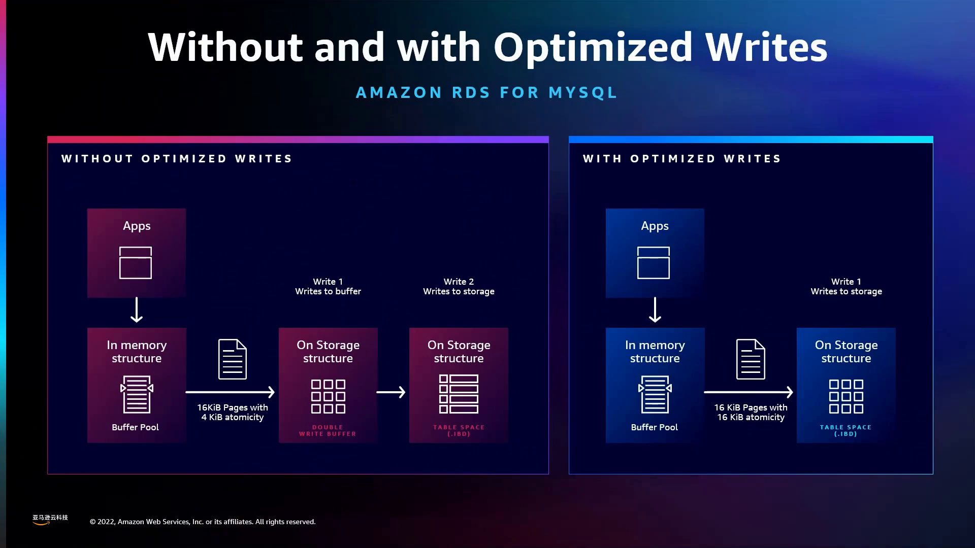 如今,MySQL在亚马逊云科技中能够执行16KB的原子写入操作,有效防止了撕裂写操作和数据损坏的风险。