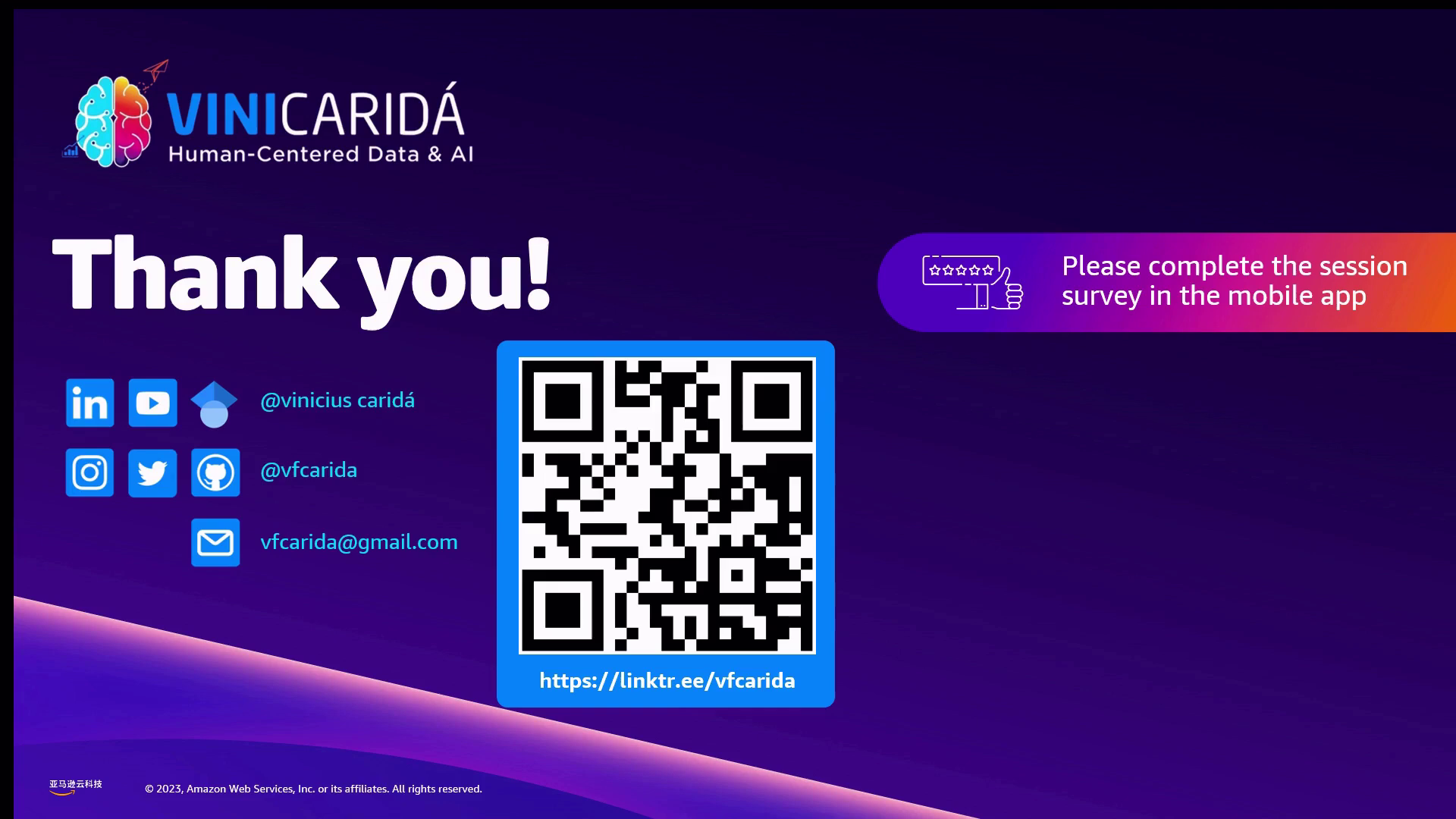 卡瓦略感谢观众参加他在2022年re:Invent上的演讲,并邀请他们在社交媒体上关注他的动态。他希望这次演讲能为大家提供一个关于生成性人工智能以及亚马逊云科技如何帮助客户安全有效地利用这一技术的有益介绍。借助云计算的强大力量和人类的创造力,可能性是无穷无尽的。但我们必须始终以人类需求为核心来发展技术。