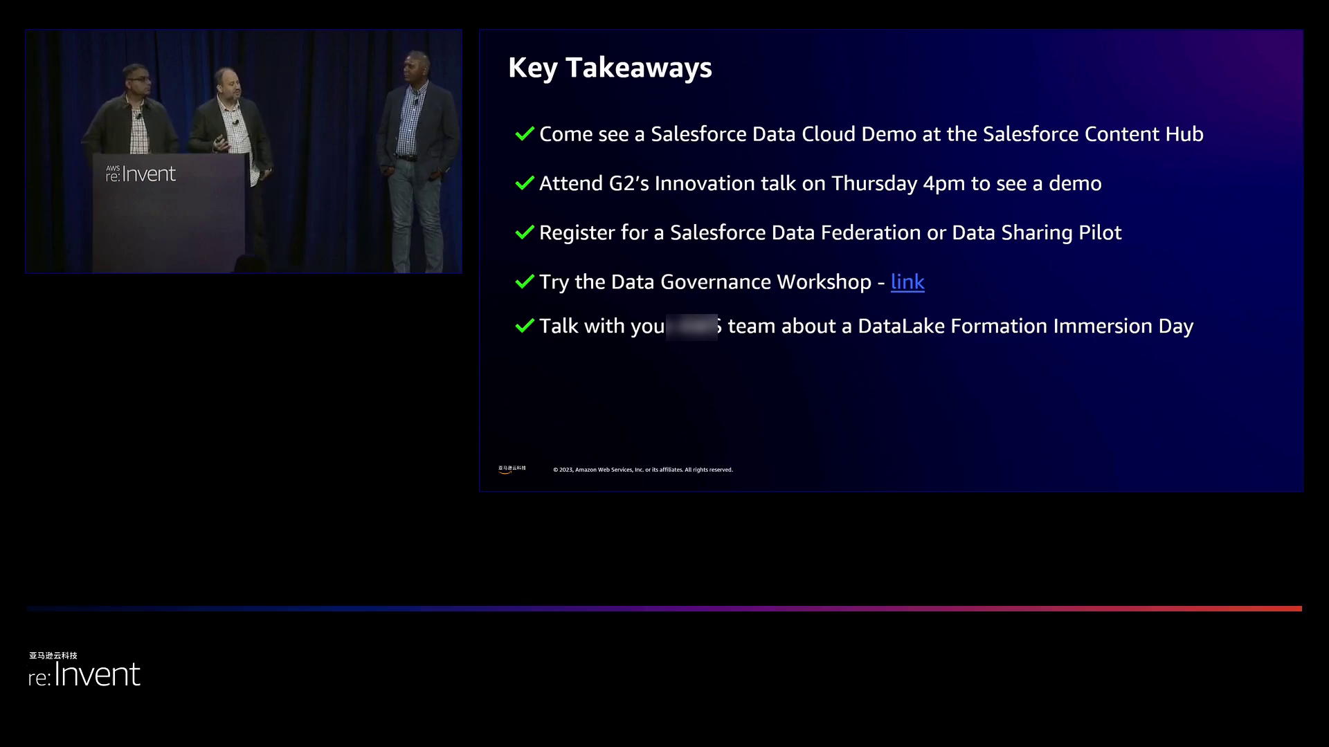 演讲者强调了解决方案如何轻松且安全地共享数据,从而释放巨大价值,使公司能够跨越孤岛和业务线统一数据,成为真正以数据为导向的公司。亚马逊云科技(Amazon Web Services)和Salesforce通过治理、编目、访问控制和零ETL共享来提供互补功能,同时满足数据生产者和使用者的需求。能够利用现代数据平台将数据作为战略资产的组织将迎来美好的未来。