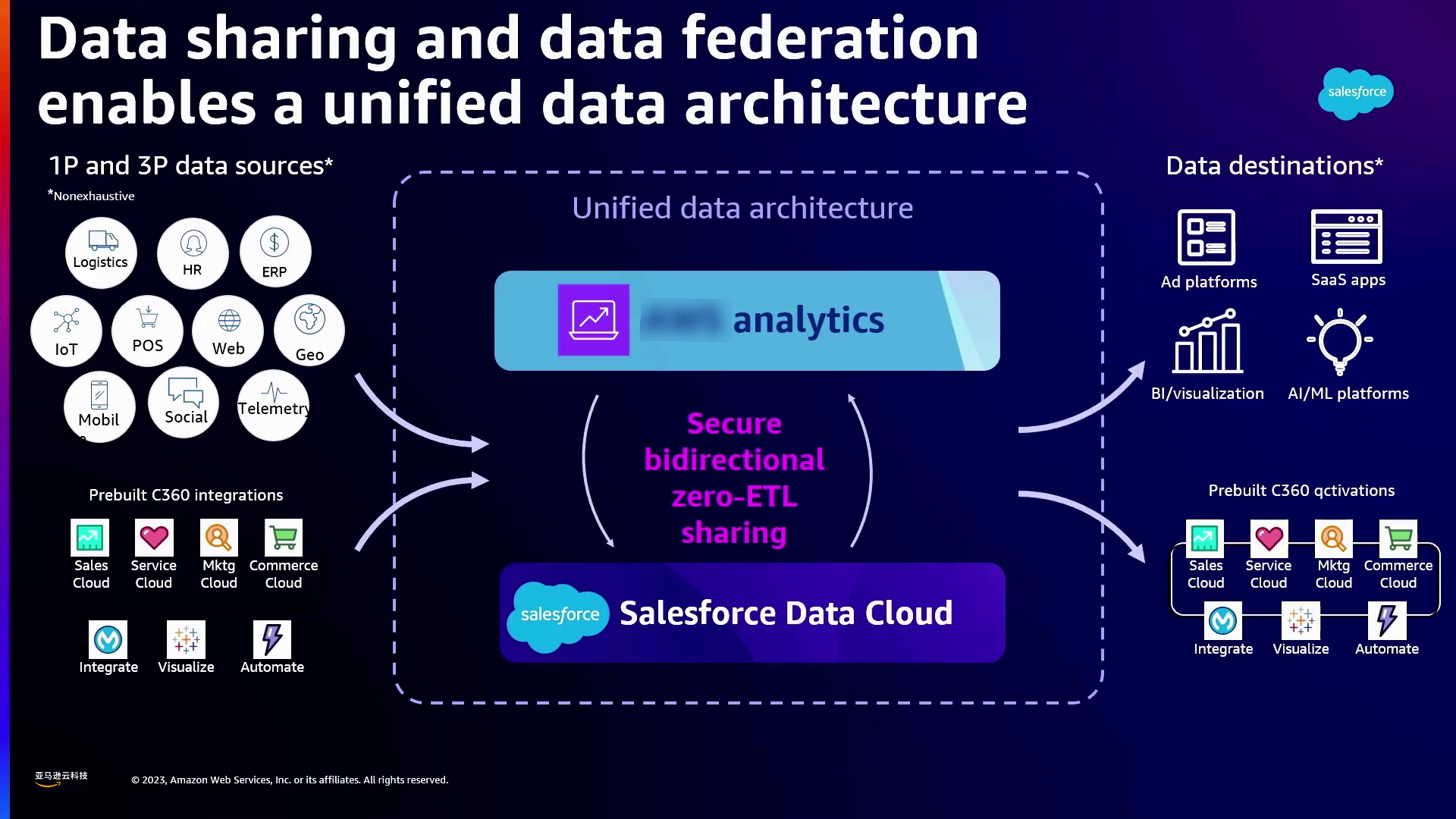 Raj详细介绍了Salesforce Data Cloud的功能,包括应用程序和数据源连接器、数据预处理、身份识别和解散以及激活。它基于Salesforce的Hyperforce公共云基础设施,每月处理超过2万亿条记录。Raj强调了Data Cloud的实时数据统一功能和到亚马逊云科技(Amazon Web Services)的零ETL共享如何共同实现卓越的客户体验。
