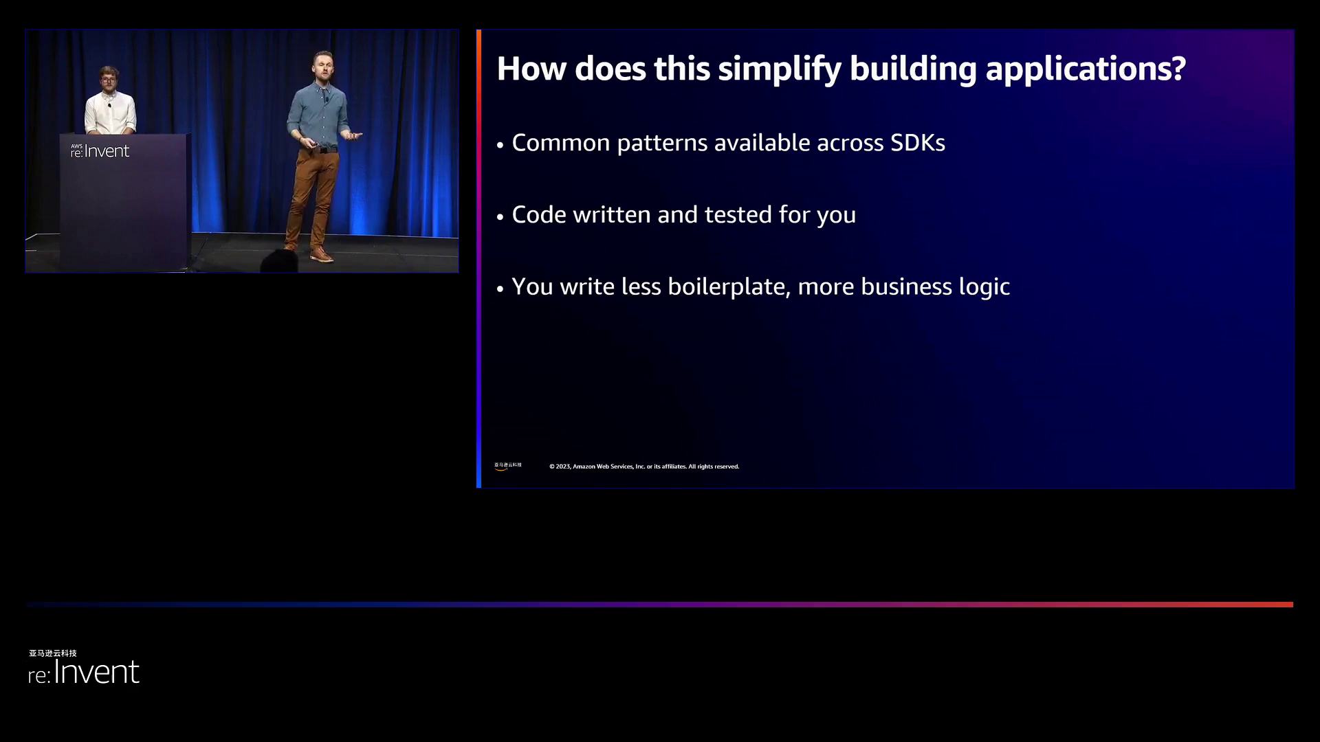 伊恩和亨特的演讲详细介绍了如何利用亚马逊云科技的SDK简化应用开发的过程。他们分享了关于模型驱动API开发、内置SDK功能和可插拔架构的深入见解。强调模型驱动API开发应以客户体验为核心,并通过反向推动来实现这一目标。这种方式可以在服务间和语言间建立一致性,为客户提供统一的体验。此外,这种方法还可以将常见的客户行为直接构建到SDK中,从而简化开发过程。
