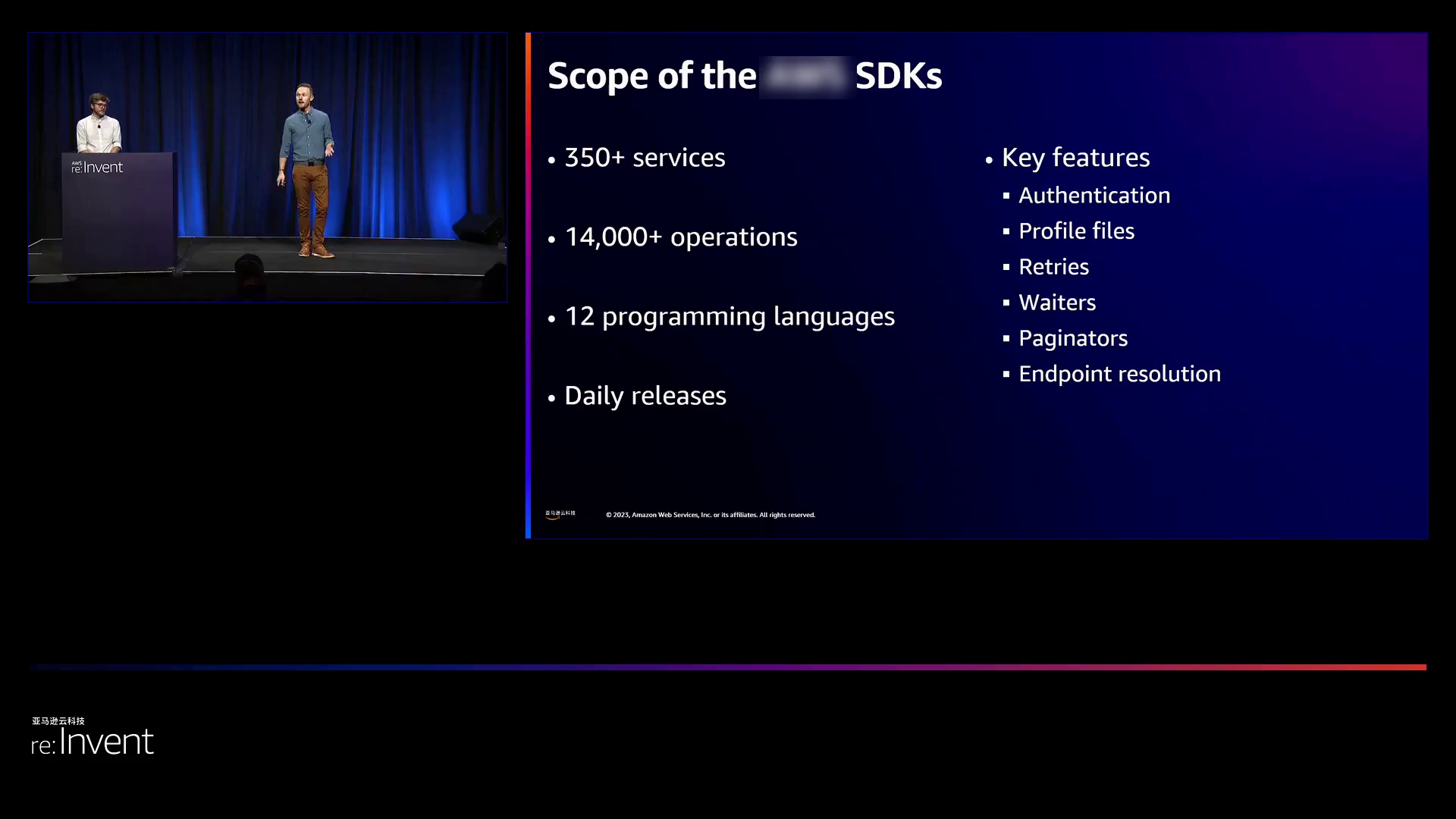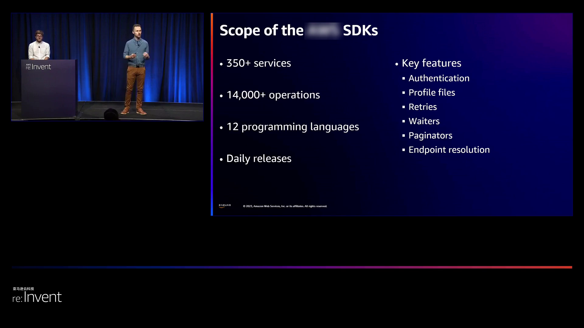 作为全球领先的云计算公司,亚马逊云科技提供超过350项服务,涵盖了12种编程语言的数千个操作,并每天进行更新以紧跟最新的服务和功能。其SDK(软件开发工具包)内置了诸如认证、重试、等待器和分页等通用功能,以应对调用亚马逊云科技服务的复杂挑战。