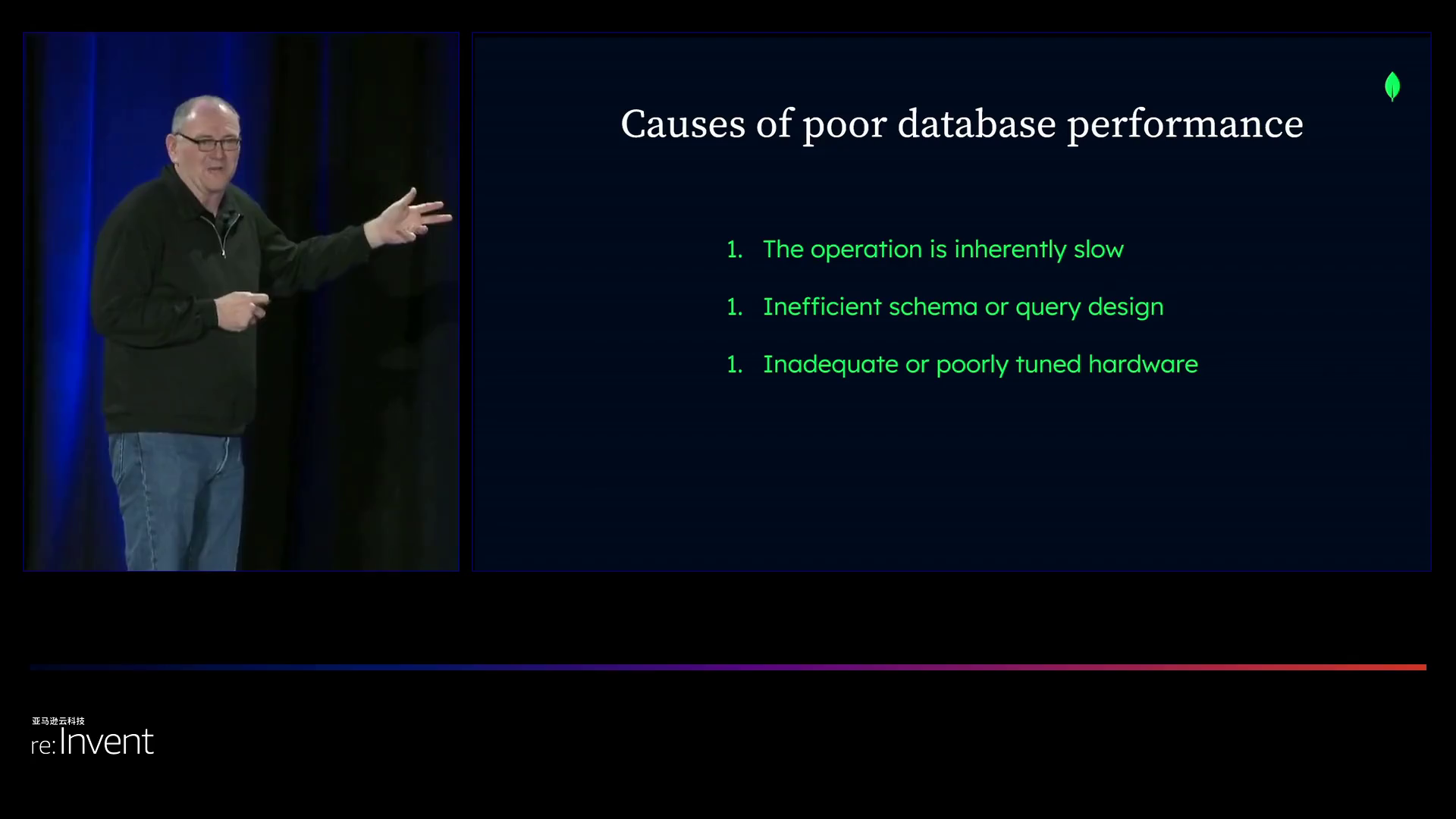 瑞克·奥拉在re:Invent的亚马逊云科技演讲中,探讨了优化数据库性能的架构设计最佳实践。他强调了良好的性能应包括快速的响应时间、高吞吐量、高效性和可扩展性。这些领域性能不佳的根本原因通常是数据使用不当,例如过度嵌入信息或过度规范化。