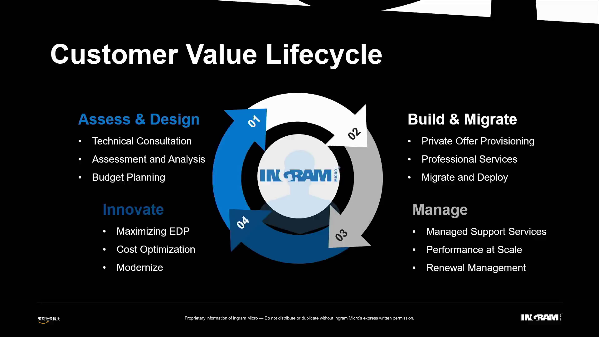 IngramMicro作为亚马逊云科技的合作伙伴,通过AmazonWebServicesMarketplace提供定制私有产品,为客户提供技术评估、设计咨询等增值服务,帮助优化云支出。其全球覆盖和庞大的合作伙伴网络简化采购,降低许可成本。