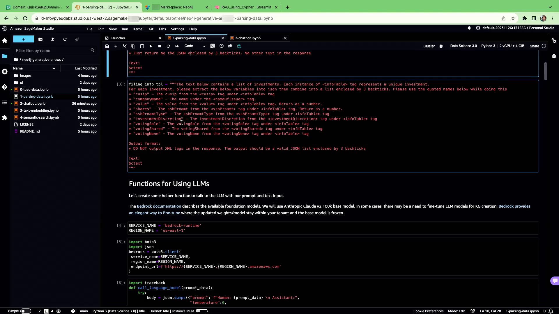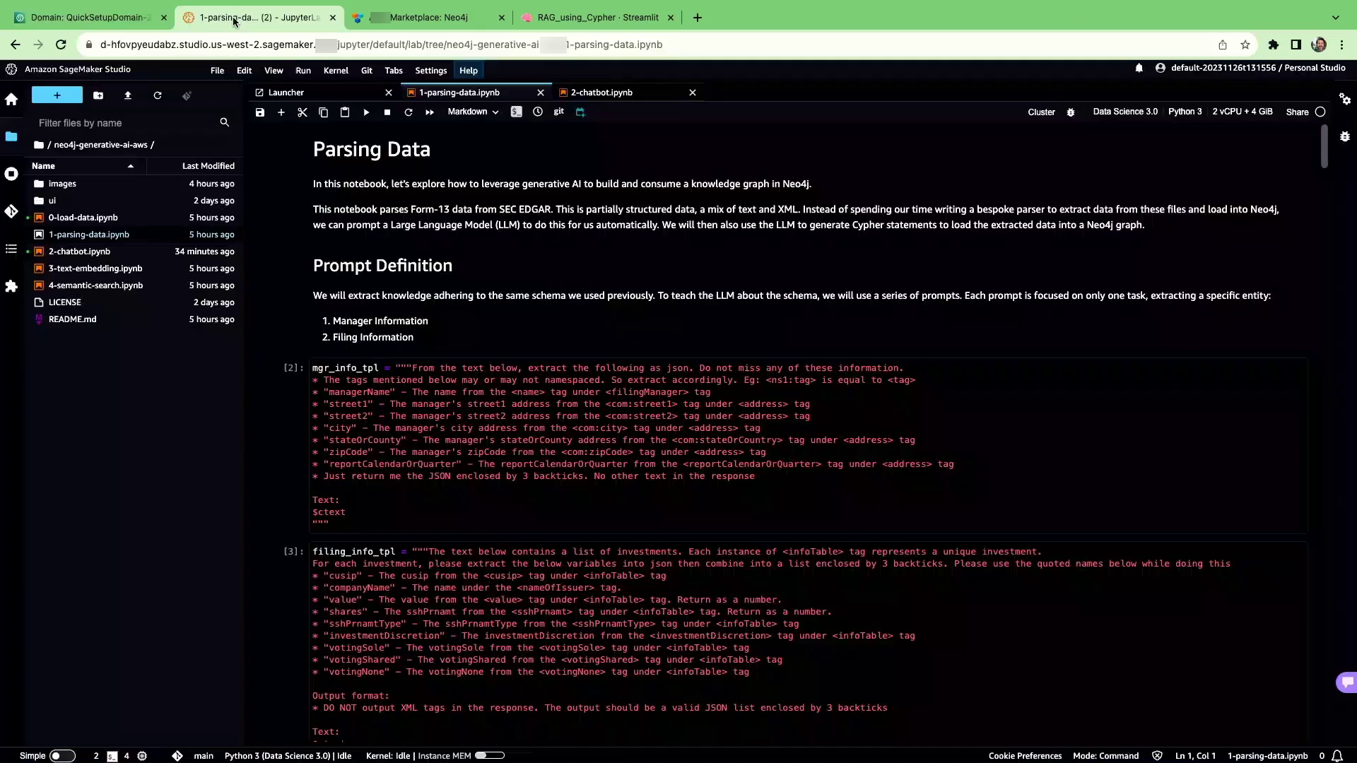 这个演示展示了一个从美国证券交易委员会(SEC)发布的文件中提取数据的用例。这些文件包含了资产管理公司如果管理资产超过10亿美元就必须每季度提交的披露报告。报告列出了如Fidelity和Vanguard等公司的所有股票和持股情况。Bedrock使用XML和表格混合数据处理这些复杂的文件,以提取关键实体并将其加载到Neo4j中,以构建金融行业知识图谱。