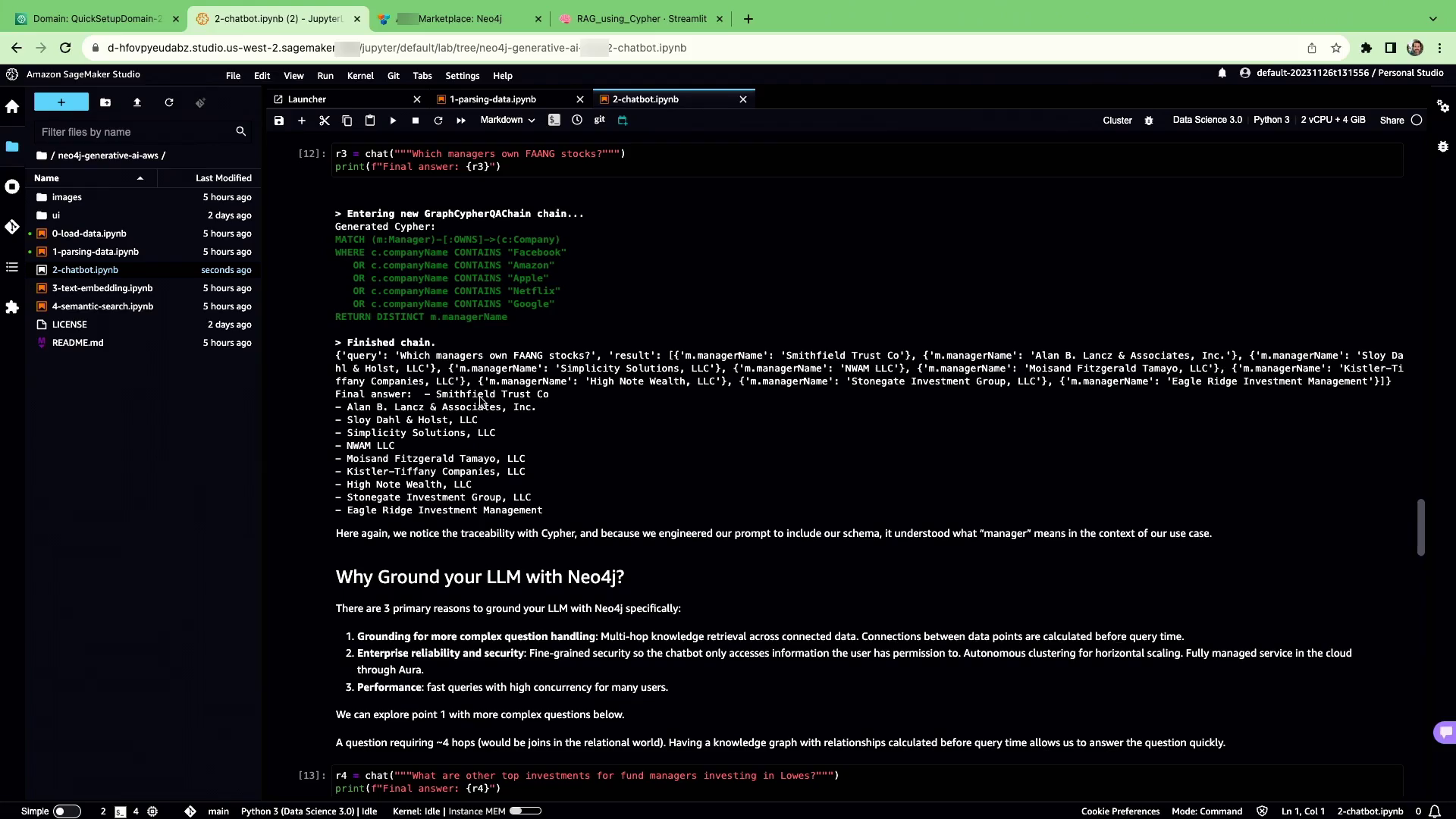 演示展示了两个主要的工作流程。首先,通过Bedrock将金融数据输入到Neo4j知识图中,同时提取元数据,如经理姓名和资产详细信息。其次,一个聊天机器人查询图形以回答自然语言问题。聊天机器人将其自身的知识与图形数据相结合。例如,它知道什么是FANG股票,并能查出拥有这些股票的经理有哪些。聊天机器人通过Bedrock将问题转换成Cypher查询。图形查询的结果被综合成自然语言回复。这展示出将语言模型与结构化知识图相结合的强大之处。