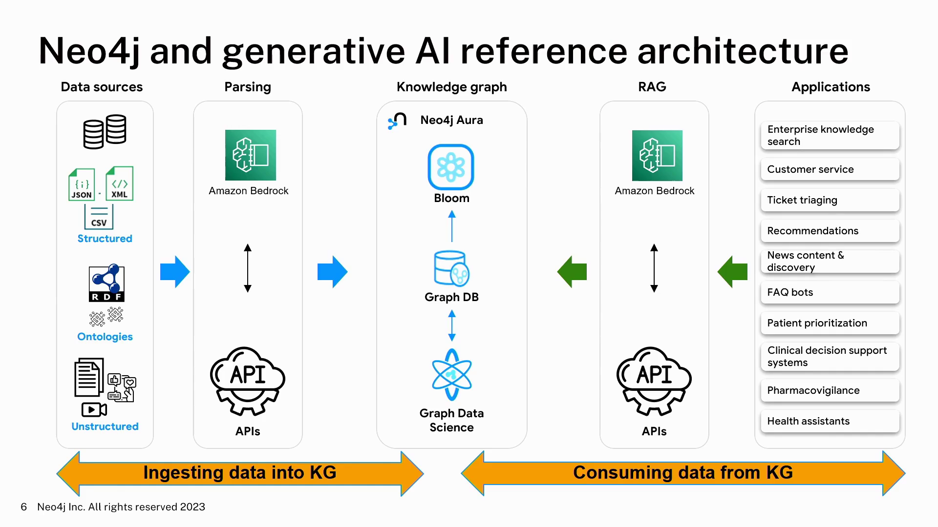 Anthony提供了一个示例架构,包括两个阶段:将数据摄入到Neo4j的知识图中,然后消费这些数据来驱动应用程序,如聊天机器人。演示使用了包含资产经理持仓信息的真实世界金融SEC备案数据。Amazon SageMaker Studio调用Bedrock处理所有备案文件并在Neo4j中构建完整的知识图谱。