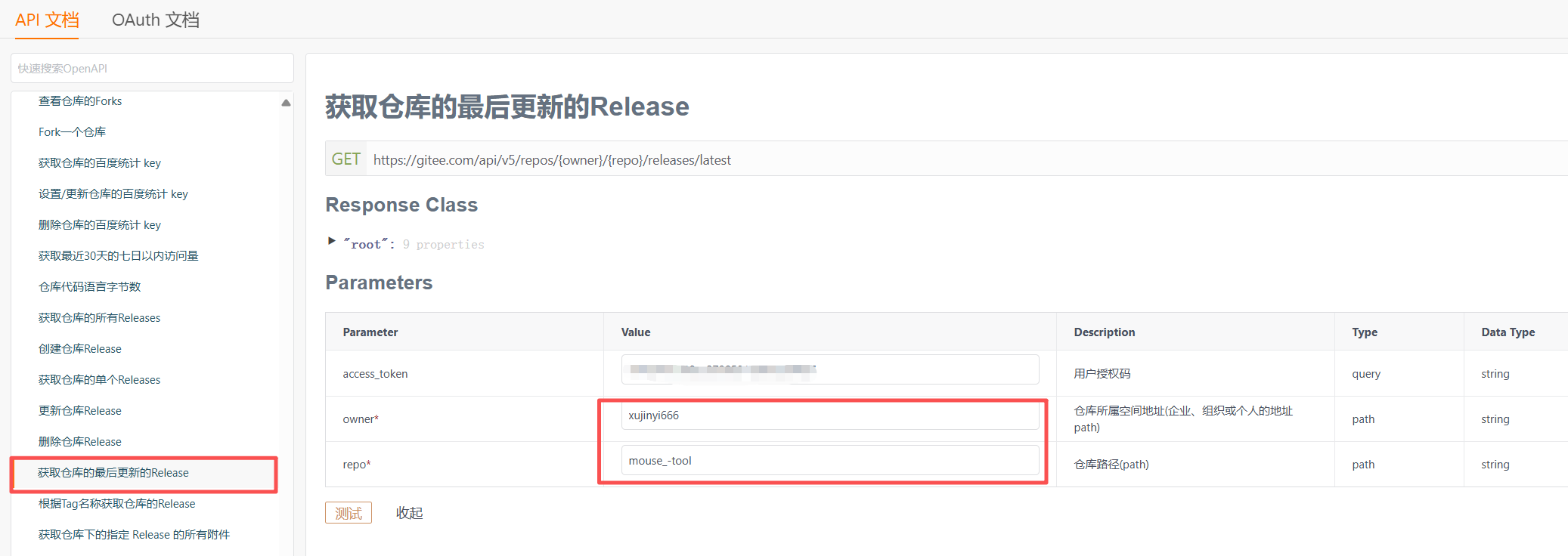 2.百度搜索gitee api文档,选择获取最后一次更新的release,填写令牌,名字,路径。