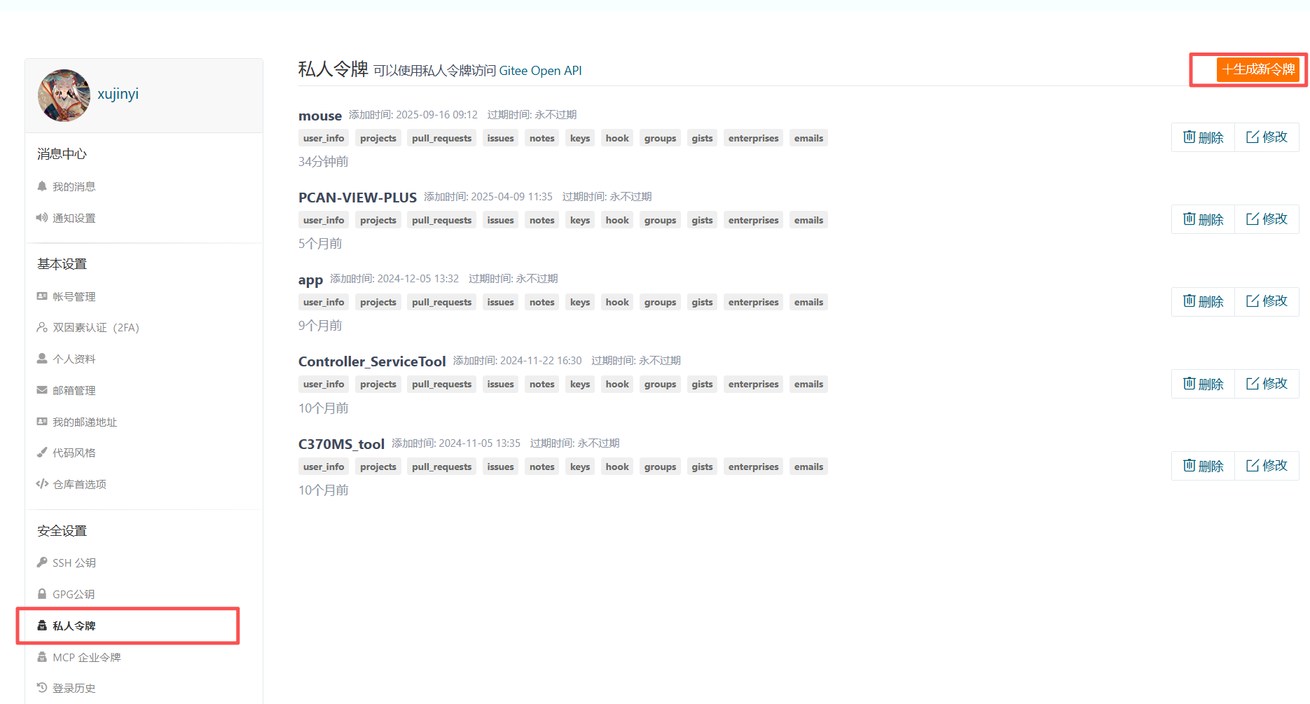 1.先登录gitee;设置中找到个人令牌,申请一个个人令牌。(一定要先复制下来,关闭就得重新申请了)。