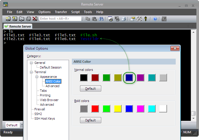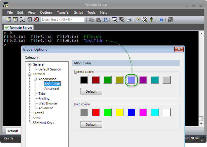 如果启用“使用配色方案”选项后仍然没有获得所需的颜色,则表明远程主机/应用程序可能正在使用不适用于配色方案的 ANSI 颜色转义序列。在这种情况下,您需要在全局选项中编辑 ANSI 颜色选项,以反映您对远程主机/应用程序发送的 ANSI 颜色代码的偏好。