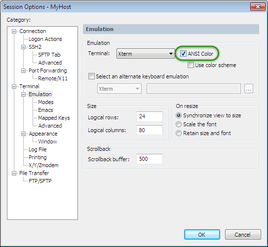 如果您已确认所需的配色方案会话选项内选择,它是可能的ANSI颜色中选择终端/仿真的类别会话选项对话框同时启用,但使用的配色方案的选项未启用。通过允许使用配色方案的Normal 属性前景色和背景色代替 ANSI 颜色Normal属性前景色和背景色,启用使用配色方案选项来解决问题。