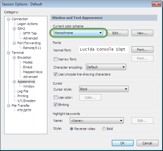 要将提供的或自定义的配色方案应用于单个会话,请从Session Options的Terminal / Appearance类别中的Current color scheme下拉列表中选择它。