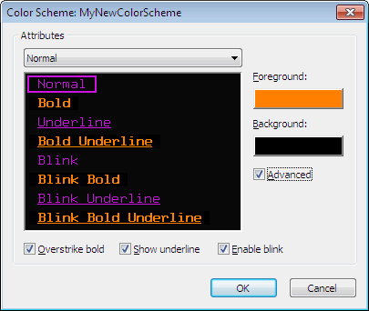 在Global Options / Terminal / Appearance / Advanced 中,从列表中选择所需的配色方案,然后选择Edit...编辑前景色/背景色,如上面创建自定义配色方案主题中所述。