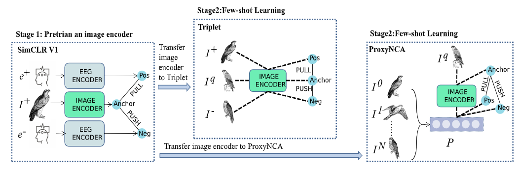 对于机器来说,利用有限的样本学习信息实现图像分类是很困难的,但对于人脑而言,人脑具有泛化性,可以通过少数几个例子就可以轻松识别新物体;研究认为人脑的这种泛化能力可体现在 EEG 信号中,所以该文章考虑将EEG加入图像分类的少样本训练中,以辅助图像分类。