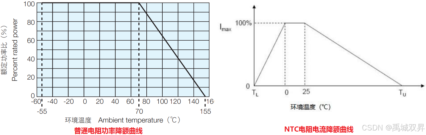 普通电阻的功率降额曲线一般在70℃以上需要降额使用,NTC电阻的电流降额曲线显示了在0~25℃温度范围外都需要降额使用。本文介绍了自己对电流降额曲线的理解,并探讨了0℃以下NTC电阻需要电流降额使用的原因。