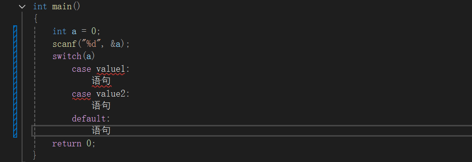 a表示变量,value表示其中的值,在case和数字之间必须加上空格,在switch后输入需要判断的变量并在case中说明多种情况加上:,这里的default和else的意思相同,当需要执行多条语句时同样需要{}来区分