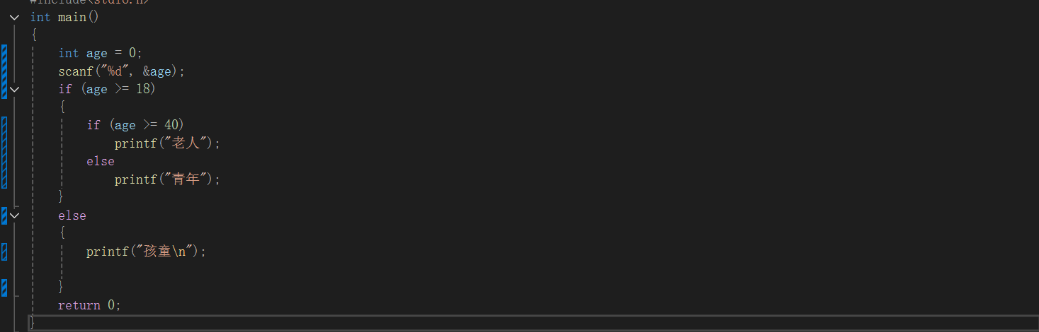 如果我们需要在一个表达式为真后在进行下一步的细分,就要用到if的嵌套了,例如我们要判断一个人是孩童,青年还是老人,用if语句的话就要使用嵌套的形式来细分了