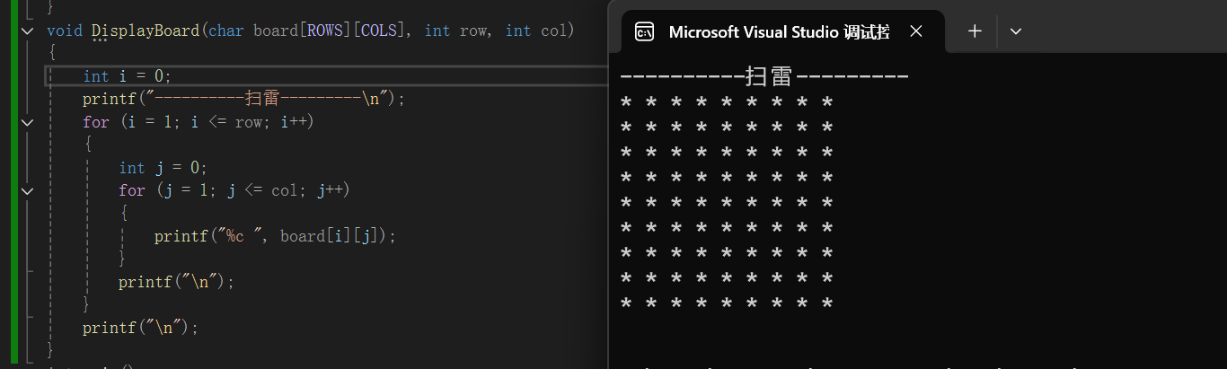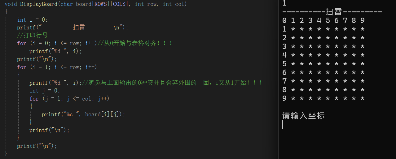 这样就伴随一个问题,“当用户选择的位置周围确实没有雷的时候也是0,那是不是会出现不记得此位置是否排查过了的情况呢?”所以我们用'*'来表示未知的位置,也就是说我们需要在创建表格后在进行把所有‘0’换成‘*’的初始化的过程。因为有两个表格,所以这也需要一个函数。
