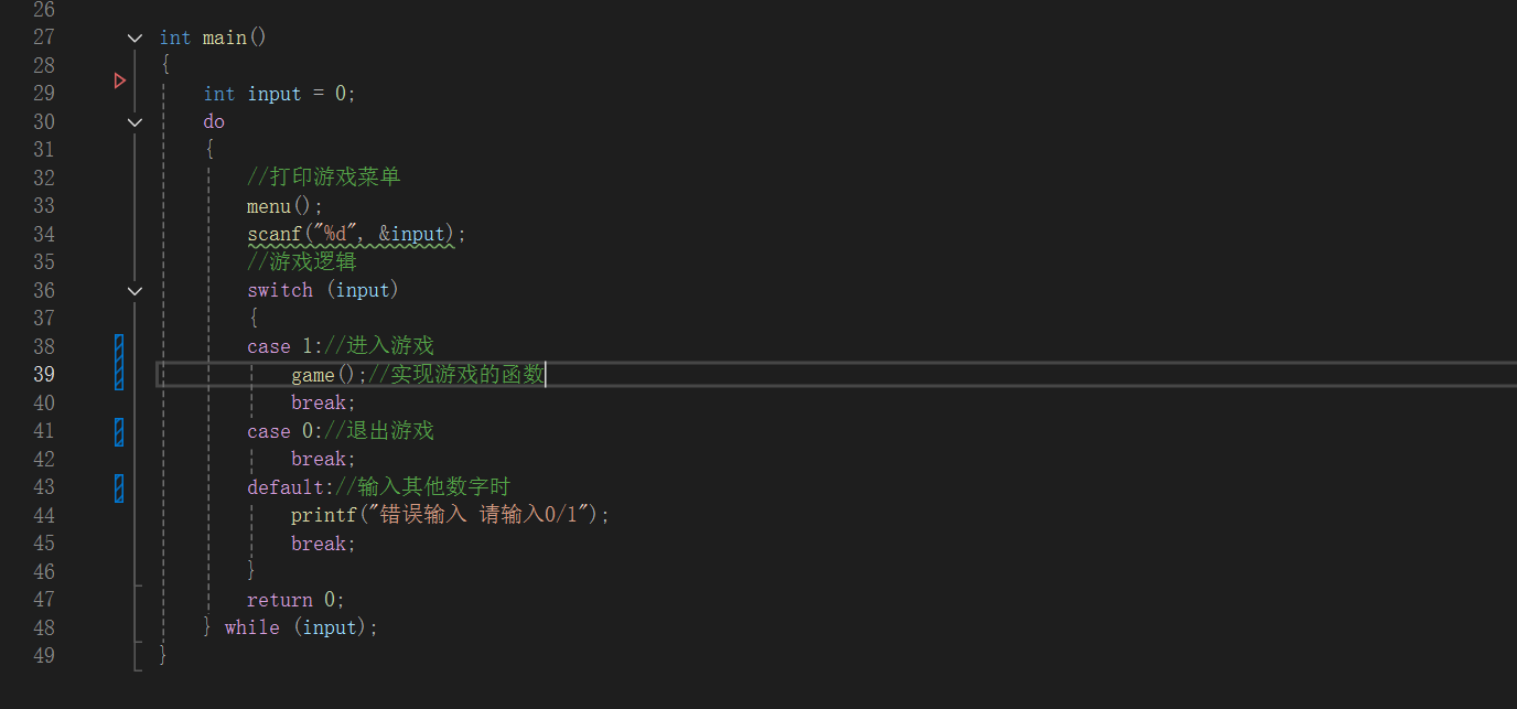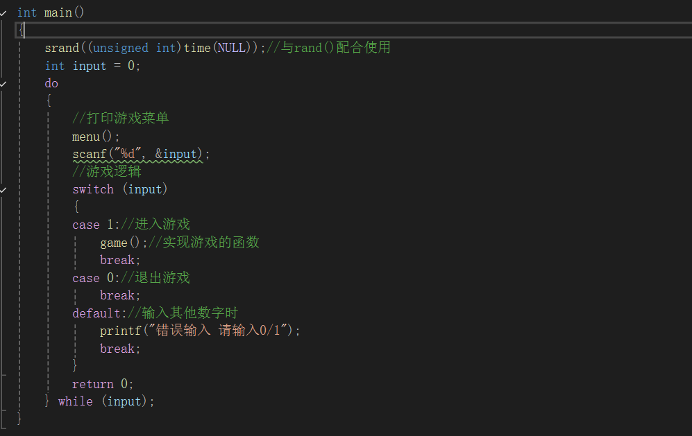进入游戏后肯定要打印菜单,无论如何需要执行一次,所以我们用do-while的结构来写代码,我们把打印菜单也设计成一个函数为menu,实现游戏逻辑的函数为game,假设当用户输入1(input==1)时我们正式进入游戏,并用switch语句来分析不同情况,就可以得到: