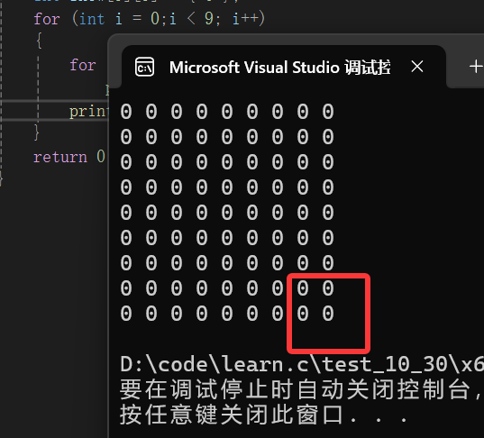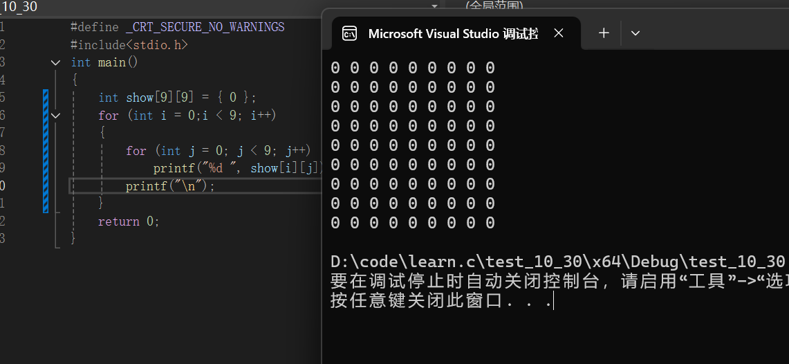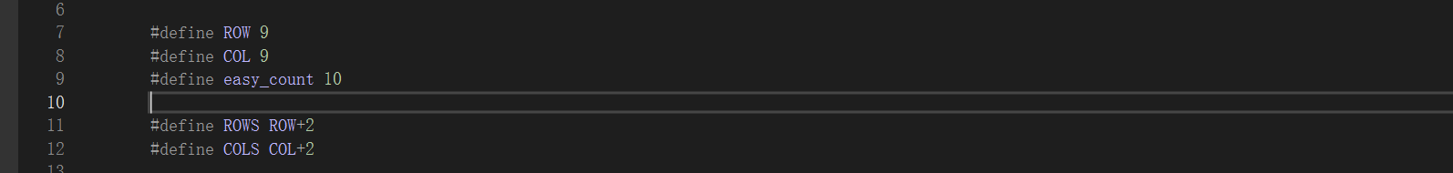 为避免这样的问题,我们有想出了其他办法。把宽和高各加2,也就是在外围再加上一圈就完美解决了这个问题。我们创建11*11的表格,但仅在9*9的表格里做修改并打印给用户,这样周围就一定可以侦测到九个元素。明白这两大问题,我们就还需一个更大的宽和高为ROWS和COLS分别为需要的宽和高再加2。明白以上问题,我们终于能对表格进行以下声明与创建: