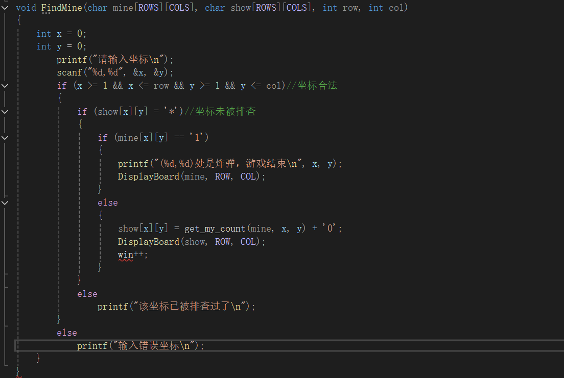 void FindMine(char mine[ROWS][COLS], char show[ROWS][COLS] ,int row, int col);