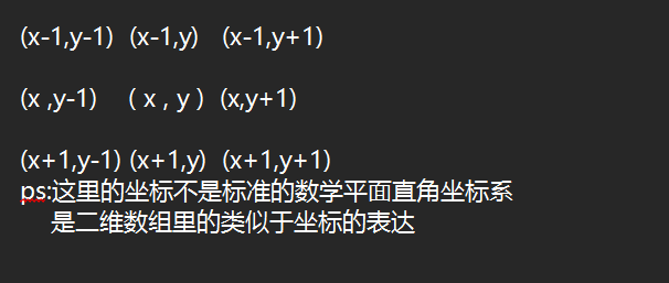 我们在初始化mine数组时知道,在未初始化之前的元素均为0,而初始化后部分变为1,所以我们只要找到周围八个元素把他们加起来算以下有几个‘1’就行了。那我们得到了(x,y)这个中心坐标后就很容易把周围的元素坐标表示出来了