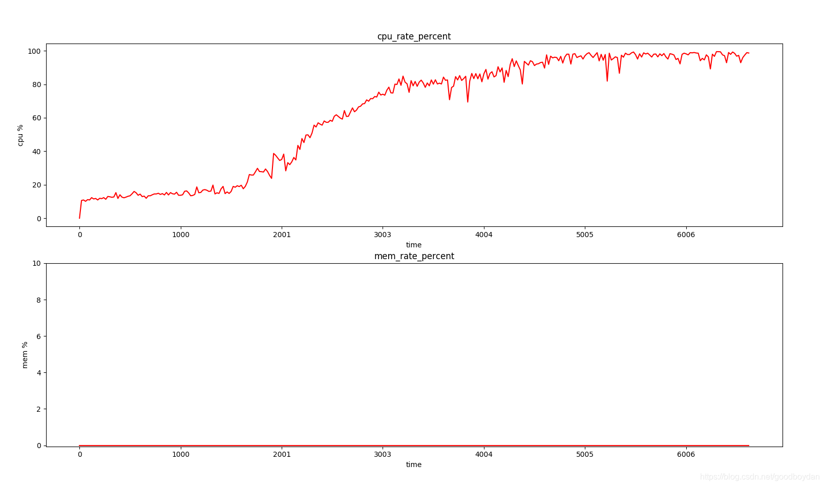 由于多线程运行,无法有效监测执行针对lxc容器复制启动及运行所产生的cpu与内存开销改为在不启动其他应用程序的情况下监测整个物理机的cpu和内存使用率,且这一数据更有实际意义。