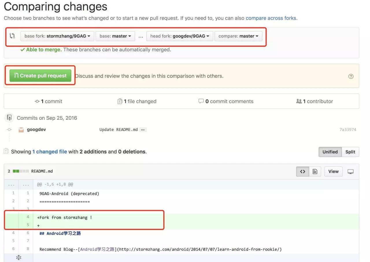 这个页面自动会比较该项目与原有项目的不同之处,最顶部声明了是 stormzhang/9GAG 项目的 master 分支与你 fork 过来的 googdev/9GAG 项目 master 分支所做的比较。