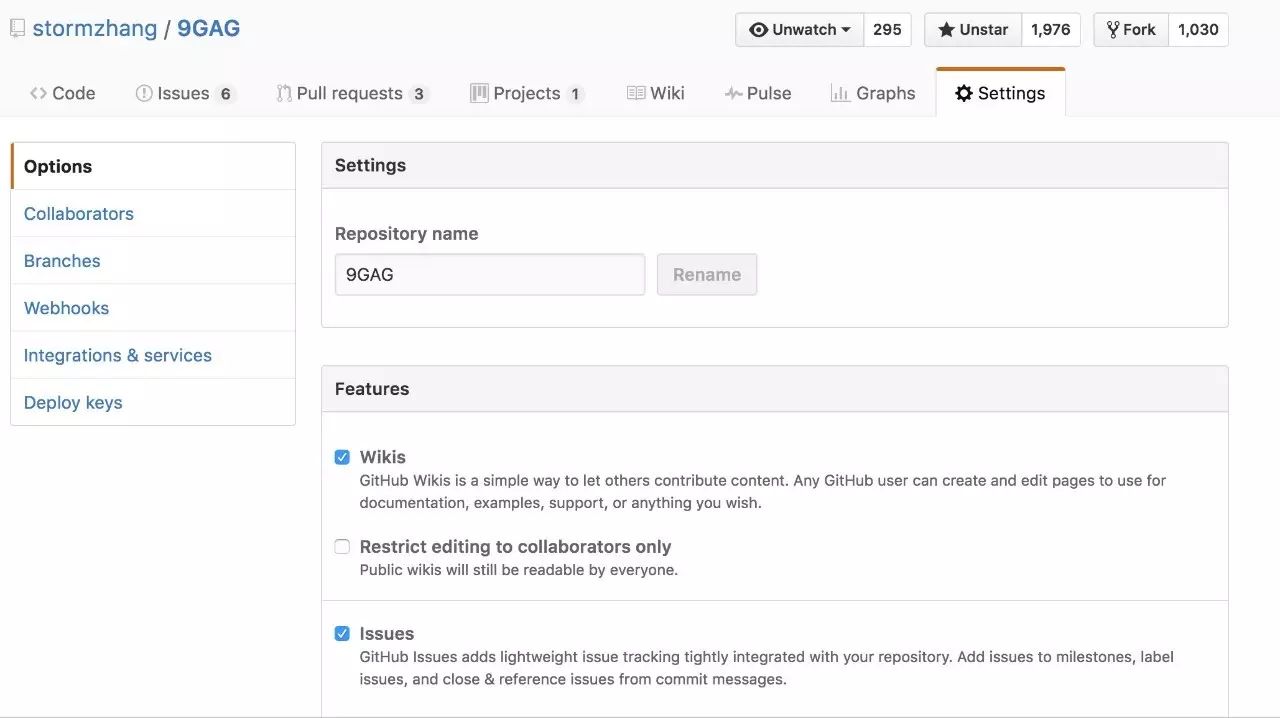如果一个项目是自己的,那么你会发现会多一个菜单 Settings,这里包括了你对整个项目的设置信息,比如对项目重命名,比如删除该项目,比如关闭项目的 Wiki 和 Issues 功能等,不过大部分情况下我们都不需要对这些设置做更改。感兴趣的,可以自行看下这里的设置有哪些功能。