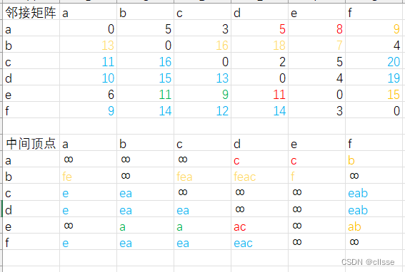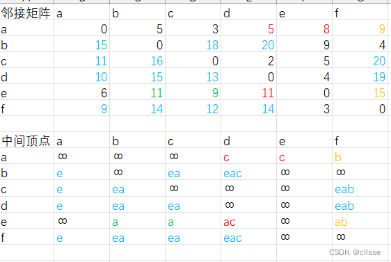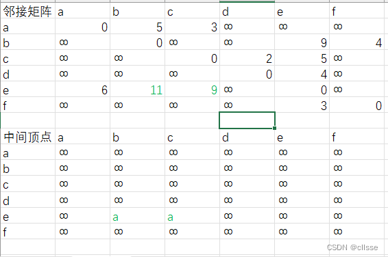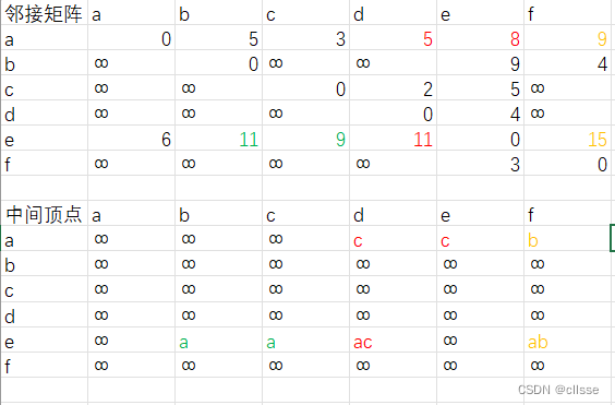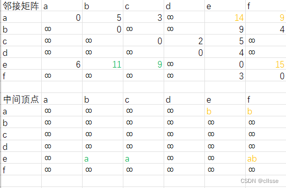 上图加入中间顶点a后,路径多了e->a->b和e->a->c。