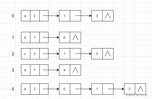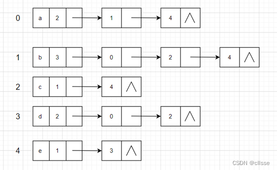 逆邻接表:最左侧格子为终点。在有向图中,为图中每个顶点vi建立一个入边表。