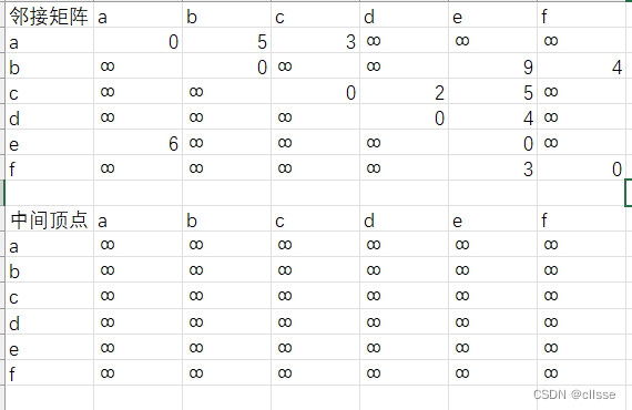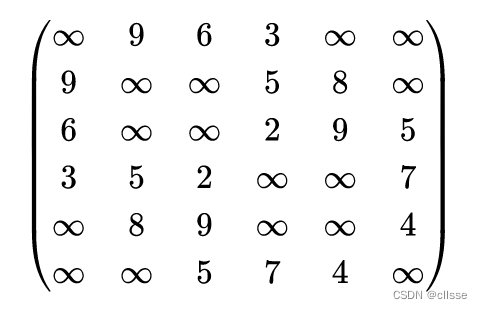 邻接矩阵:对于有向图vij表示顶点i到j是否有弧(有1无0),当弧带权重时,vij表示顶点i到j弧的权重(没有弧则∞)。对于无向图vij表示顶点i到j是否有边(有1无0),当边带权重时,vij表示顶点i到j边的权重(没有边则∞)。