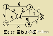 如图6-27,若从顶点2出发,此时2在V1中且边(2,4)权值最小,取顶点4,此时4在V1中且边(4,3)权值最小,取顶点3,然后以此类推取顶点1,6,5。