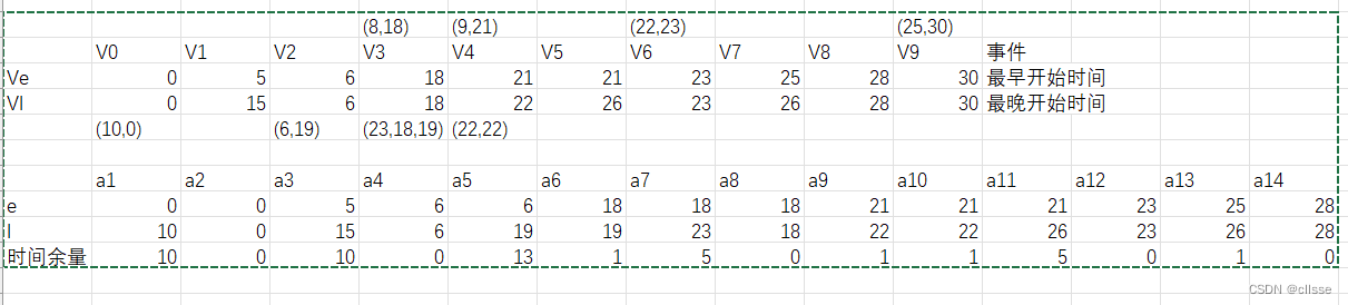 - 然后求e,a1弧尾V0最早开始时间0,a2弧尾V0最早开始时间0,...,a14弧尾V8最早开始时间28。