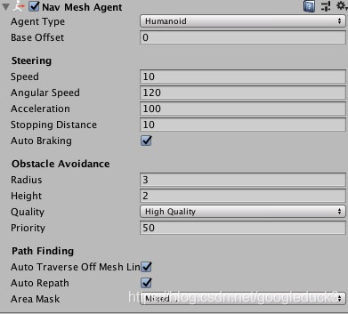 - 完成路面烘焙后,在需要使用寻路功能的物体上添加NavMeshAgent组件,使用该组件的功能完成寻路。
