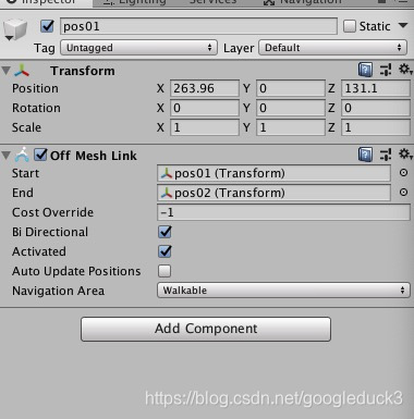 在需要连接两个物体的其中一个物体中添加off mesh link组件,然后设置Start 和 End即可使用
