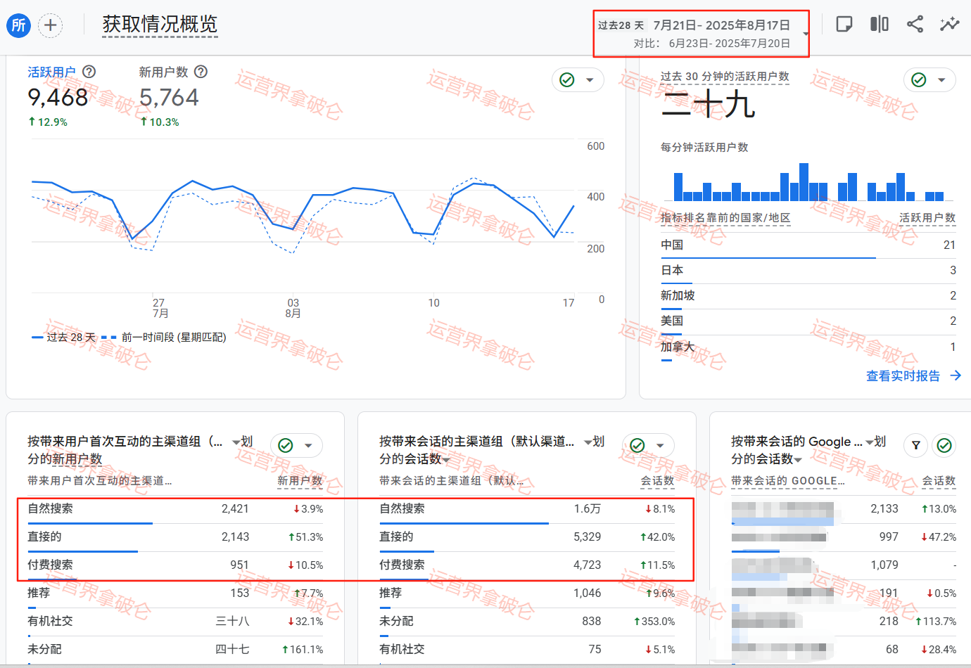 积极增长: 网站整体用户获取呈现强劲增长,活跃用户和新用户都有显著增加。这表明营销和 SEO 策略是有效的。